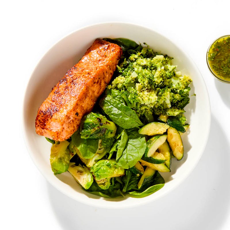Canola and Olive Oil Blend, Butter, Oregano, Spinach, Broccoli , Garlic Powder, Black Pepper, Cumin, Cilantro, Lemon, Garlic, Brussel Sprouts, Sweet Paprika, Zucchini, Kosher Salt, Apple Cider Vinegar, Lemon Juice, Crushed Red Pepper, Salmon, Italian Parsley