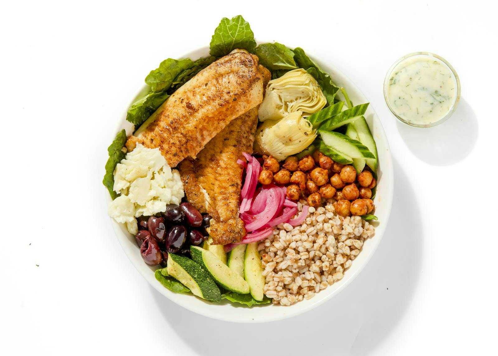 Grilled Cajun tilapia anchors this sun-drenched bowl of farro, marinated artichokes, grilled zucchini, and roasted chickpeas. Kalamata olives and crumbled feta bring briny contrast, while a cool herb yogurt sauce ties it all together with a tangy finish.
