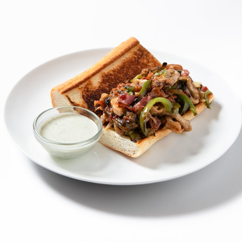 Everything you love about Philly’s signature sandwich—with a tasty twist. Chef Tracey stuffs a toasted hoagie roll with the traditional sweet grilled onions and peppers, but instead of shaved beef, she subs in juicy, well-seasoned chopped chicken thighs and smoky bacon for a super-flavorful filling. Then she smothers it in melted Pepper Jack cheese for ooey-gooey deliciousness and a touch of jalapeño heat. It’s served with creamy, tangy buttermilk Ranch dressing for a cooling flavor contrast. Get set to indulge… just make sure you’ve got some extra napkins handy.