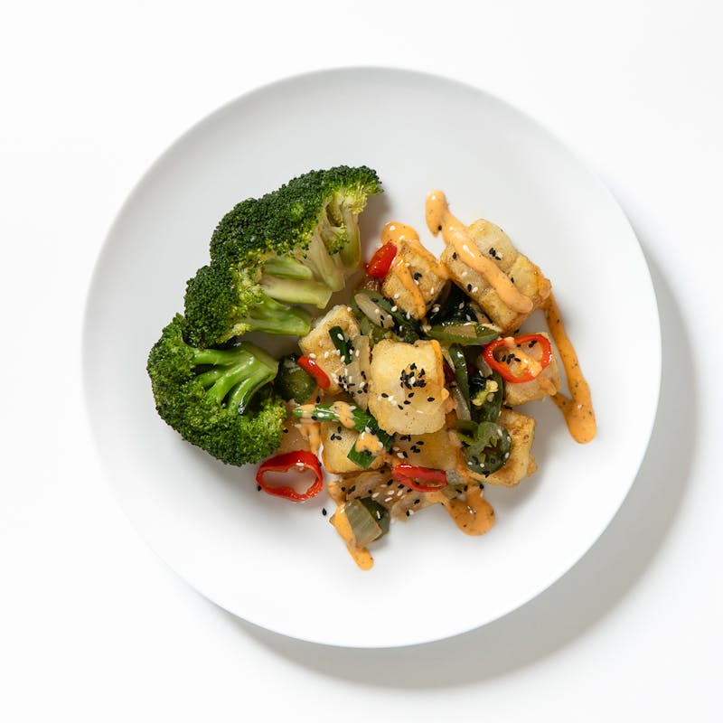 Tofu, Onion, Broccoli , Corn Starch, Green Onion, Canola Oil, Buttermilk, Mayonnaise, Fresno Peppers, Ranch Dressing Powder, Jalapeno Peppers, Sriracha, Garlic, Sesame Seeds, Black Sesame Seeds, Kosher Salt, Black Pepper