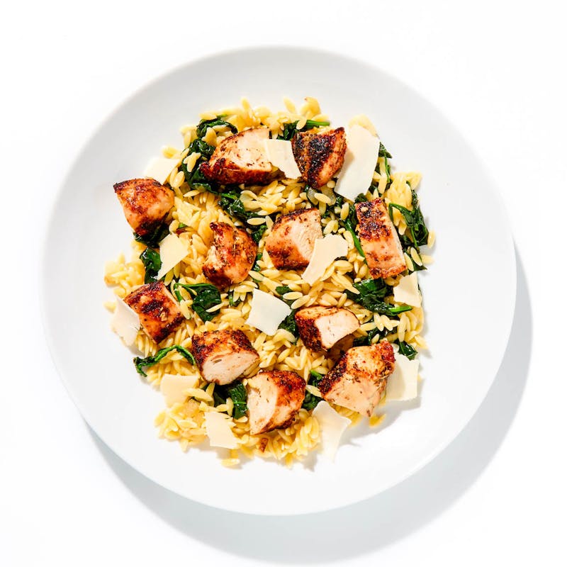 Parmesan Cheese, Canola and Olive Oil Blend, Butter, Spinach, Onion Powder, Garlic Powder, Black Pepper, Garlic, Orzo, Onion, Kosher Salt, Chicken Base, Chicken Breast, White Wine, Canola Oil, Italian Parsley, Italian Herb Seasoning, Paprika