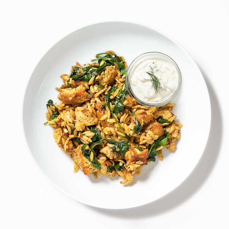 Lemon Pepper, Canola and Olive Oil Blend, Spinach, Dill, Black Pepper, Lemon, Garlic, Sour Cream, Orzo, Onion, Kosher Salt, Shallot, Mayonnaise, Chicken Breast, Canola Oil