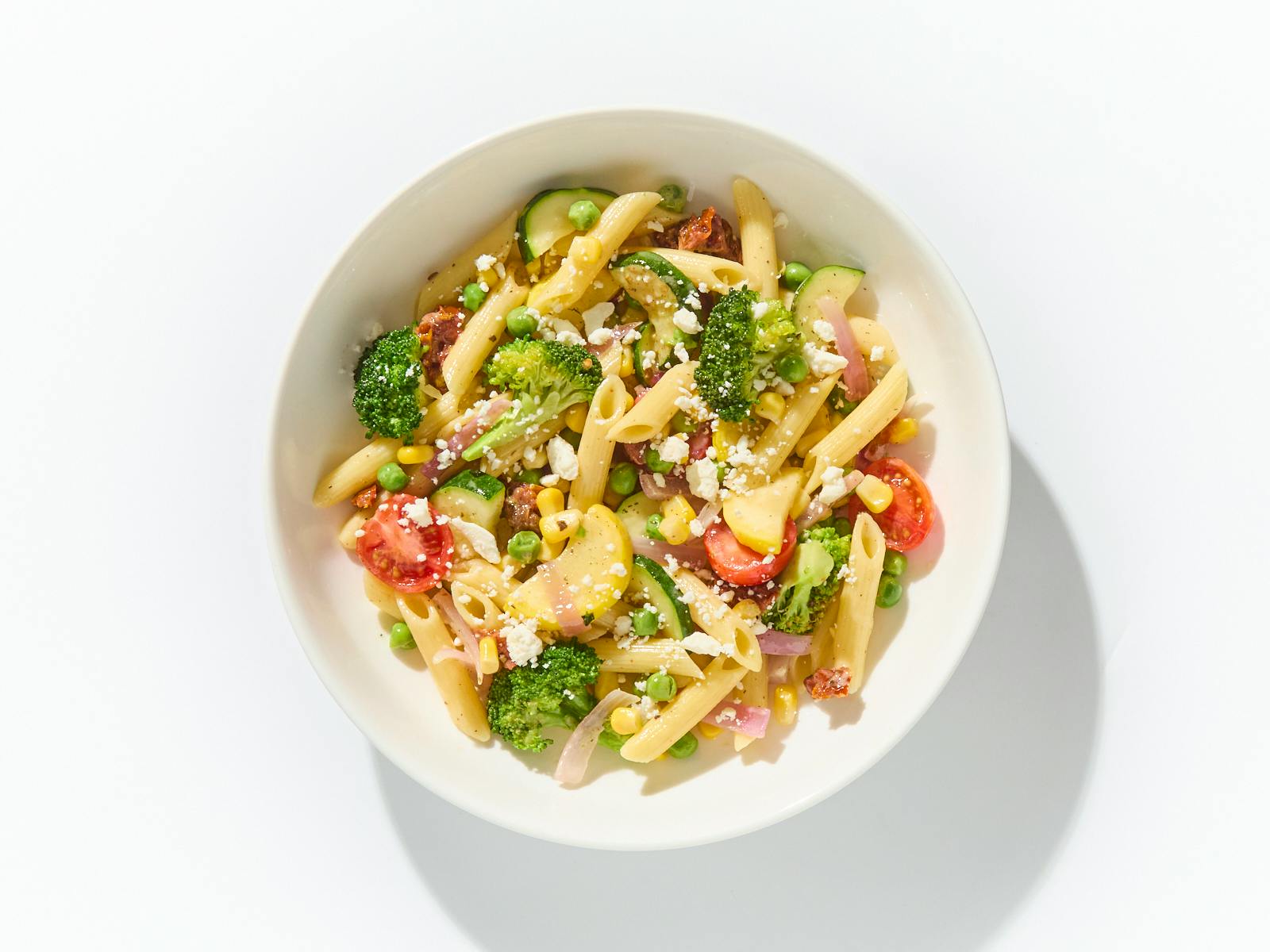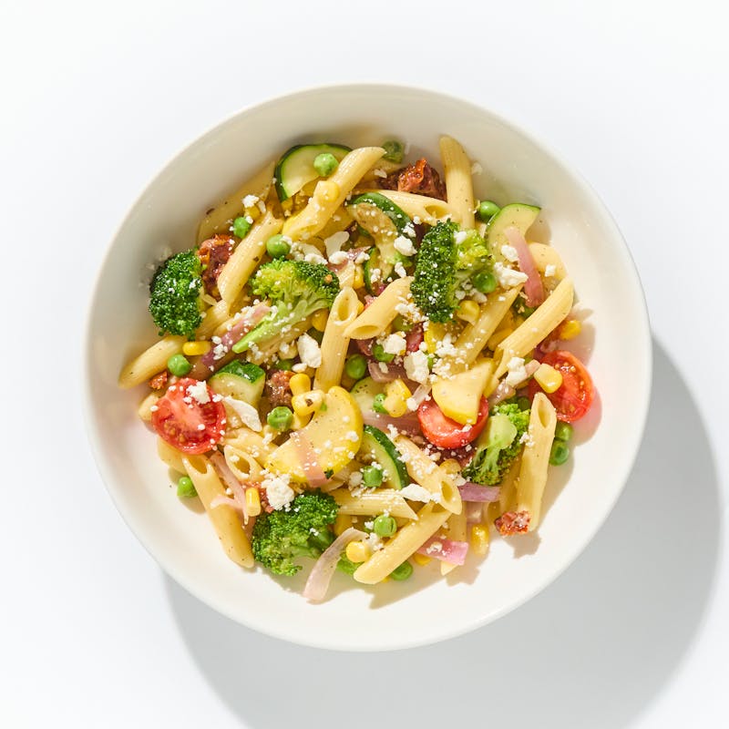 Zucchini, Cherry Tomato, Canned Corn, Black Pepper, Broccoli , Penne, Sun Dried Tomatoes, Italian Herb Seasoning, Broccoli Florets, Canola and Olive Oil Blend, Feta Cheese, Kosher Salt, Peas, Yellow Squash, Honey, Dijon Mustard, Cider Vinegar, Red Onion, Dill, Canola Oil
