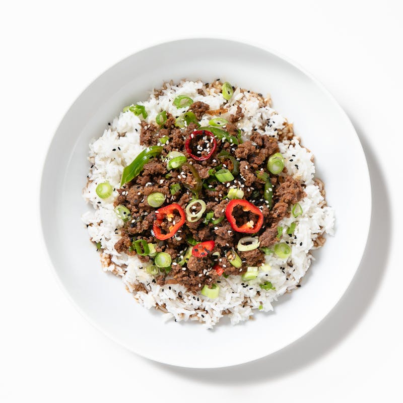 Savor the perfect balance of flavors with Chef Tracey's sweet and spicy ground beef rice bowl. Tender ground beef is seasoned with aromatic spices and a hint of sweetness that will keep you coming back for bite after bite. A bed of fluffy Jasmine rice completes the dish.