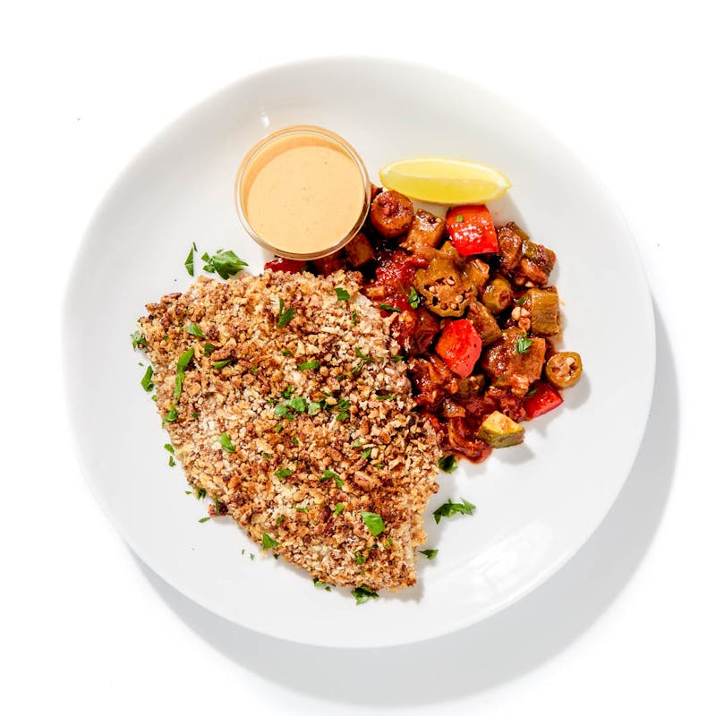 This dish nods to French-Creole tradition with a lighter, sharper edge. Tilapia is brushed with a zippy paleo mayo, then coated in crushed pecans and panko breadcrumbs that bake into a golden, nutty crust. It’s served over Cajun-style ratatouille—a sweet, citrusy, and spiced mix of roasted fennel, lemon, and cherry tomatoes. On the side, a saffron and fire-roasted pepper rouille finishes this wholesome, comforting dish with smoky richness.