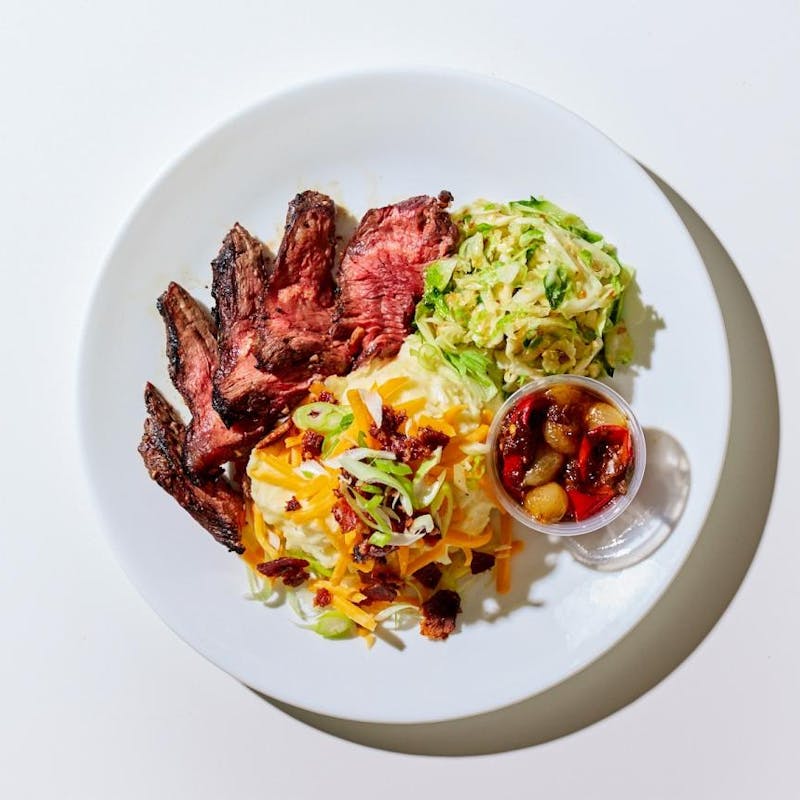 This sophisticated, elegant meal from Chef Angelia will transport you to the tables at a fancy steakhouse. The star of the dish is undoubtedly the gorgeous beef tenderloin steak, seared to perfection and served over loaded mashed potatoes with crispy bacon, cheddar, and fresh chives. Paired with lightly roasted, parmesan-laced shaved Brussels sprouts, the dish is finished with a luscious steakhouse-style sauce you'll want to pour on everything: a creamy bourbon-peppercorn sauce laced with sweet cipollini onions and cherry peppers. Turn any given weeknight into a special occasion in an instant.