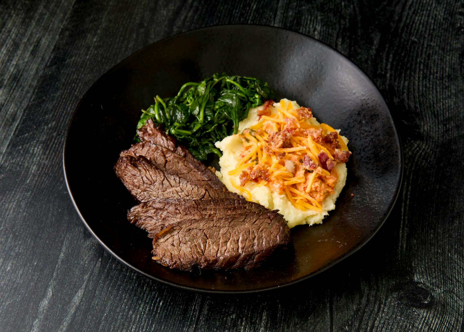 Canola Oil, Hatch Chili, Mexican Oregano, Canola and Olive Oil Blend, Bay Leaf, Butter, Canned Roasted Red Peppers, Plantain, Black Pepper, Cumin, Golden Raisins, Cilantro, Capers, Garlic, Canned Roasted Tomatoes, Onion, Basmati Rice, Worcestershire Sauce, Kosher Salt, Yukon Potatoes, Ground Beef, Red Bell Pepper, Green Olives