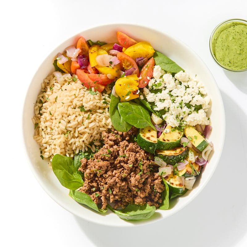 Ground Beef, Yellow Bell Pepper, Cherry Tomato, Brown Rice, Zucchini, Baby Spinach, Red Onion, Greek Yogurt, Feta Cheese, Italian Parsley, Lemon Juice, Dill, Cilantro, Black Pepper, Extra Virgin Olive Oil, Kosher Salt, Chives, Garlic, Oregano, Sweet Paprika, Cumin