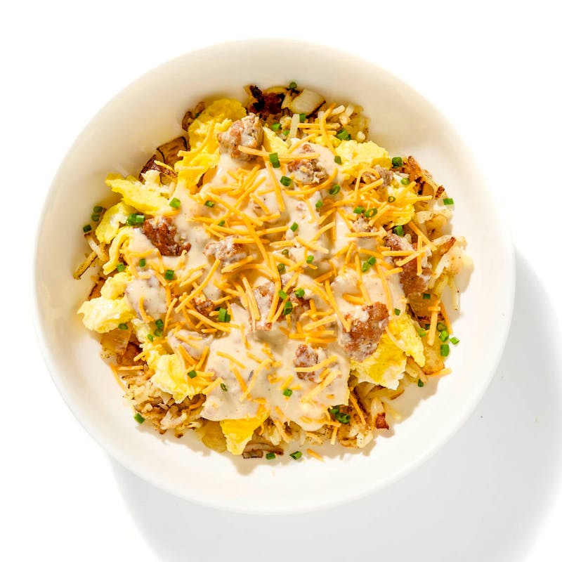 Crisp-edged hash browns form the base, layered with soft-scrambled eggs and crumbled sausage. On top: a pour of creamy gravy, rich with black pepper and garlic, finished with sharp cheddar and a flicker of fresh chives.