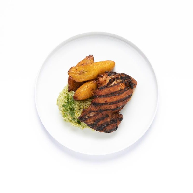 This dish is a celebration of Peruvian flavors. Tender chicken thighs are seasoned and cooked in a blend of aromatic spices like garlic, cumin, and oregano, then served alongside zesty cilantro rice with peas and carrots. The meal is rounded out by nutty brown butter sweet plantains and a creamy cilantro-lime-jalapeño sauce that adds a zing to every bite. The combination of the juicy chicken, fresh, herbaceous rice, and buttery plantains is a match made in culinary heaven!