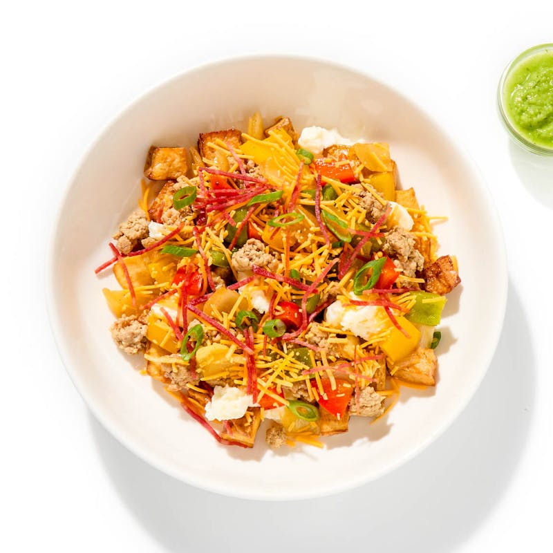 Start your day with a breakfast that works as hard as you do. Crisp turkey bacon, seasoned turkey sausage, and fluffy scrambled egg whites power this bowl with lean protein. They’re bolstered by roasted sweet potatoes, sautéed peppers, and melty cheese, with a side of tomatillo salsa for extra zest. Consider your morning, and your metabolism, officially kicked into gear.