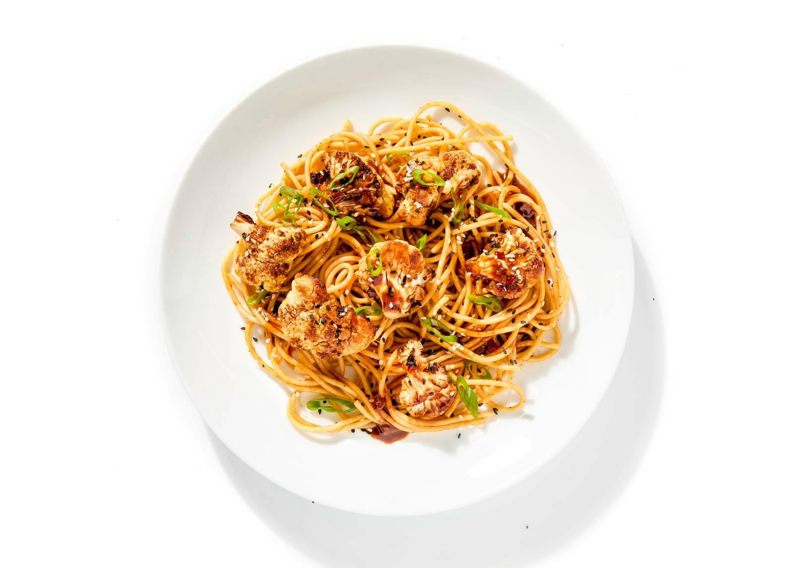 Inspired by Singaporean flavors, Chef Angelia's bold twist on pasta features crisp cauliflower tossed in a bold black pepper–hoisin sauce and finished with a drizzle of gochujang-spiked sesame oil. Enjoy it garnished with scallions and black sesame.