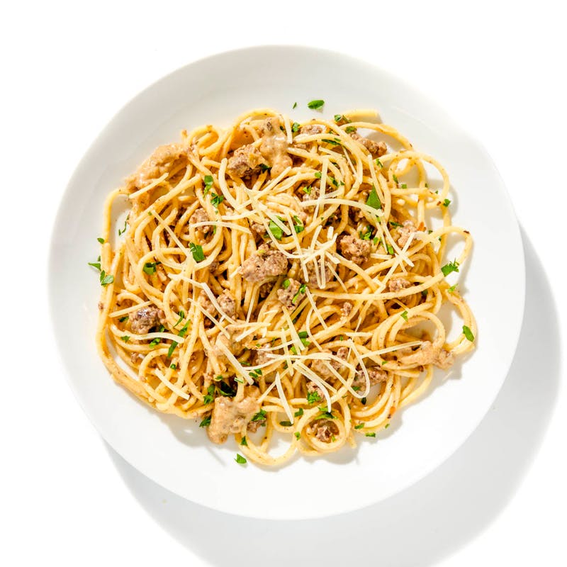This dish features cajun-spiced ground beef tossed with spaghetti and smothered in a buttery cream sauce made with cheddar, mozzarella, and parmesan.