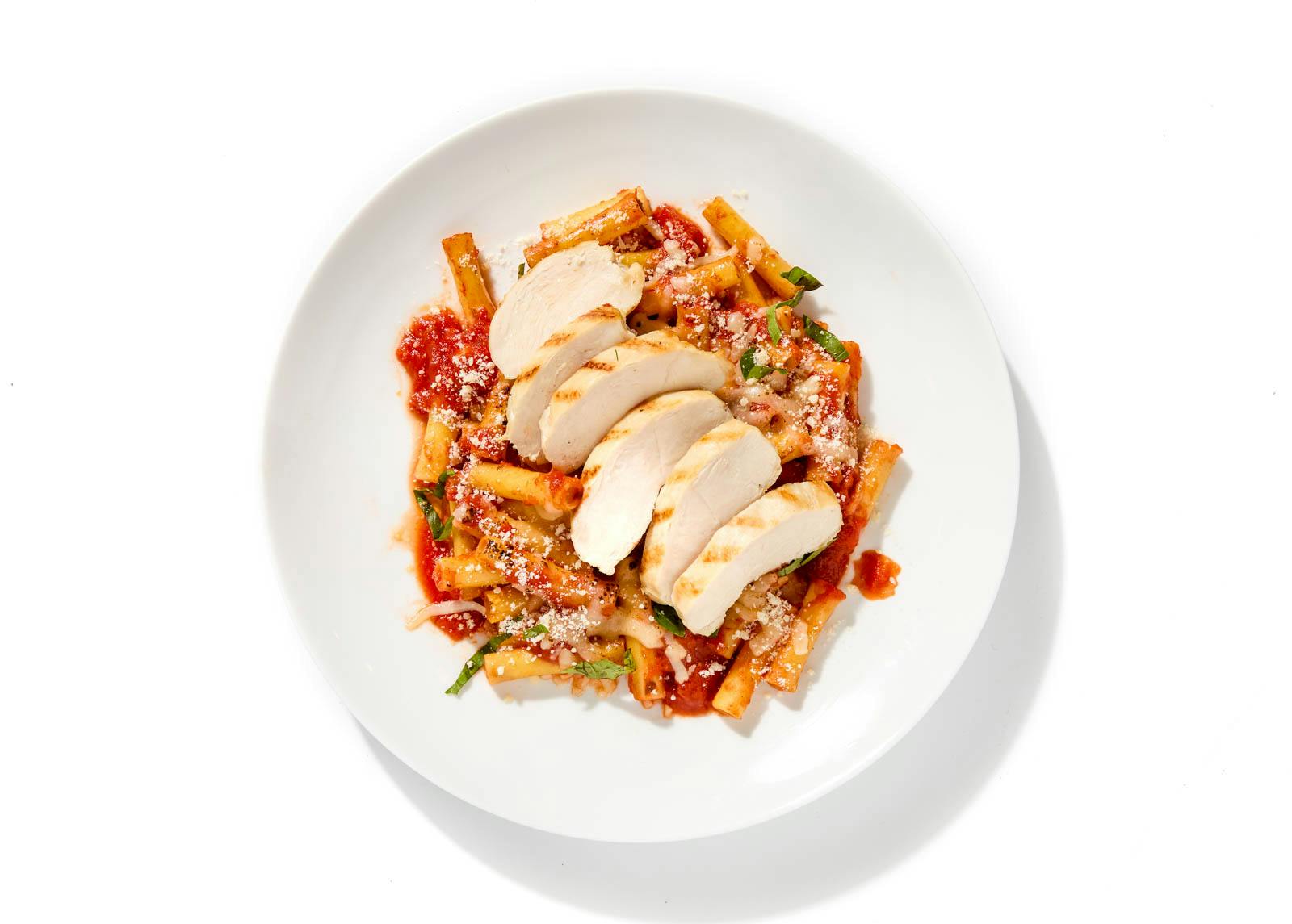 Long tubes of ziti pasta are cooked until al dente, then covered in a lush sauce made from simmered San Marzano tomatoes. Chef Jonny brings in two types of cheese (Mozzarella and Parmigiano) to swirl into the mix, baking everything in the oven until golden and oozy. Slices of grilled chicken breast add a hit of lean protein to finish this Sicilian staple.