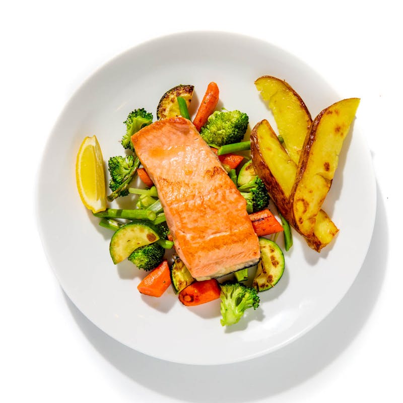 Canola and Olive Oil Blend, Broccoli , Asparagus, Lemon, Garlic, Zucchini, Kosher Salt, Rainbow Carrots, Yukon Potatoes, Thyme, Lemon Juice, Leeks, Crushed Red Pepper, Salmon