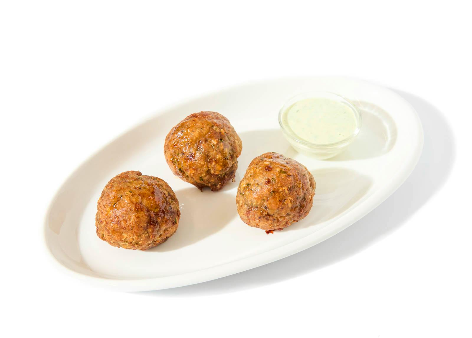 Baked ground turkey meatballs come seasoned with ginger, parsley, and a touch of Dijon, and served with a roasted jalapeño aioli on the side to bring a smoky, tangy finish.