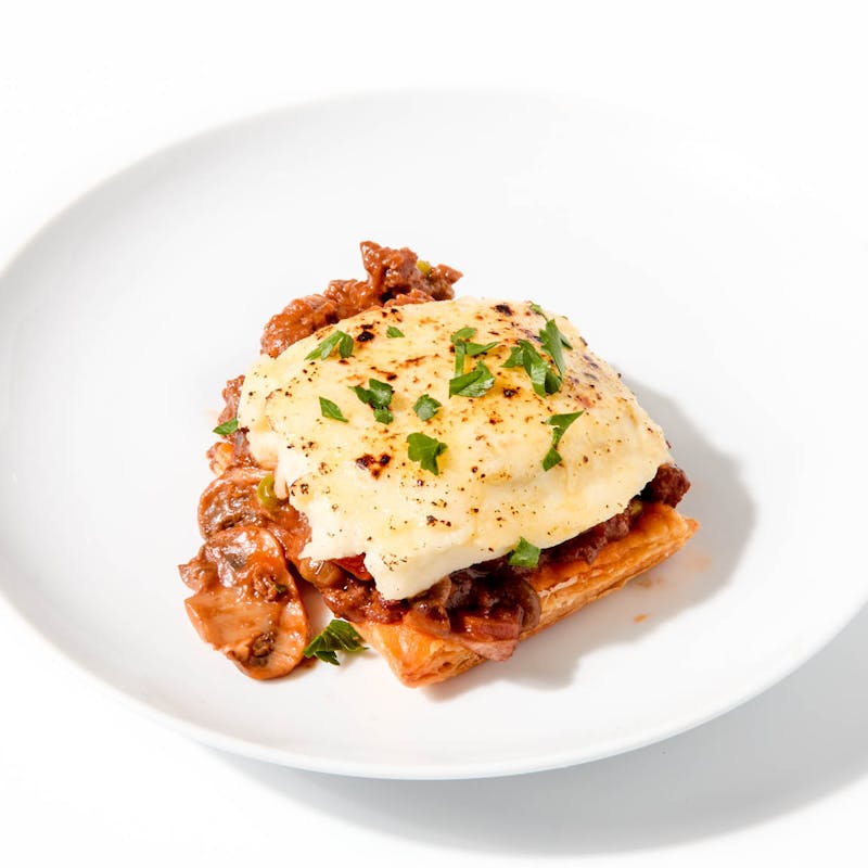 This hearty and comforting British dish never goes out of style. Ground beef is slowly simmered with sweet onions, carrots, mushrooms, and a rich, savory gravy flecked with oregano and thyme. It’s layered over a light blanket of puff pastry, generously topped with butter-whipped mashed potatoes, then baked until golden and bubbling at the edges.