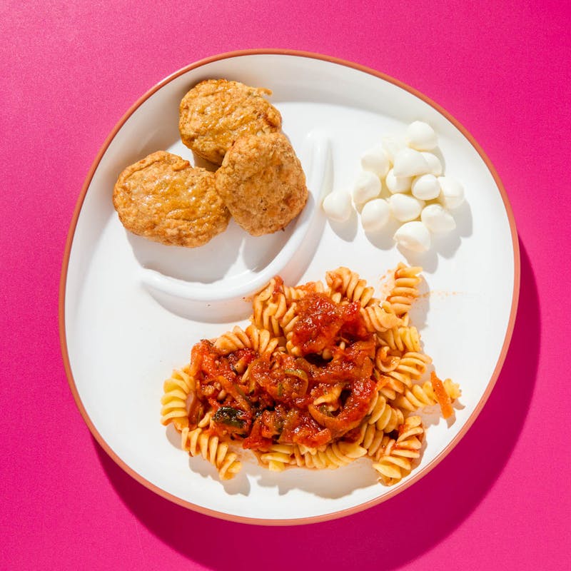Baked chicken and chickpea nuggets deliver a gluten-free, protein-rich bite kids will love. Served with rotini pasta and a marinara sauce made from tomatoes, carrots, spinach, and zucchini, the dish packs extra veggies into every spoonful. A side of mozzarella pearls adds calcium and creamy contrast.
