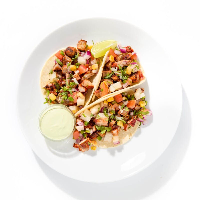 This take on tacos al pastor features slow-roasted pork shoulder marinated with guajillo chile, pineapple juice, vinegar, and warm spices like cumin and clove. It comes served with soft corn tortillas, a crunchy jicama-corn salad, and a jalapeño-studded green cream salsa.