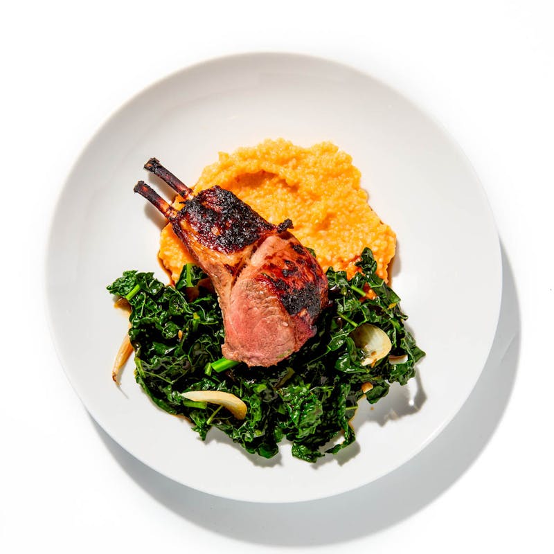 Chef April brings serious island heat to these jerk-spiced lamb chops, coating them in a fiery blend of Scotch bonnet peppers, allspice, and fragrant spices before charring them on the grill. The spice is tamed by tangy-sweet kale, while creamy sweet potato grits round out the plate with a rich, buttery finish.