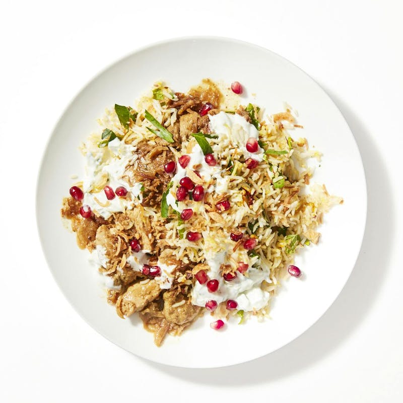 Garam Masala, Chicken Thigh, Coriander Seeds, Turmeric, Butter, Red Onion, Mint, Cumin, Avocado Oil, Cardamom, Cilantro, Cinnamon, Sugar, Basmati Rice, Kosher Salt, Saffron, Espelette Pepper , Crispy Fried Onions, Lime Juice, Greek Yogurt, Dried Cranberries, Cucumber