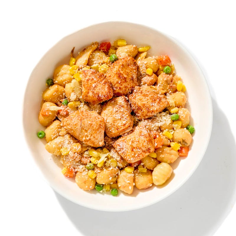 Diced chicken breast is roasted and folded into a creamy sauce built with butter, garlic, sun-dried tomato, basil, and a touch of gochujang for subtle heat. Gnocchi and mixed vegetables round out the plate, finished with grated Parmesan.