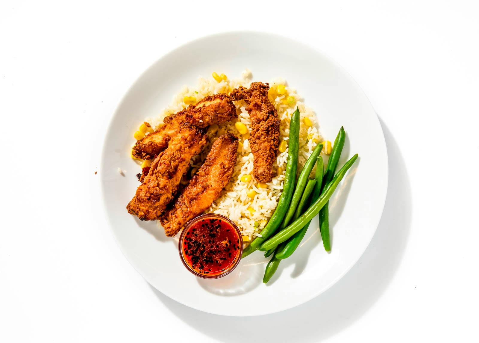 Spicy deep-fried chicken strips meet a honey-butter gochujang dipping sauce that balances sweet, savory, and heat. Chef Aarthi serves them with buttered corn rice and roasted green beans for a complete, flavor-bomb meal.