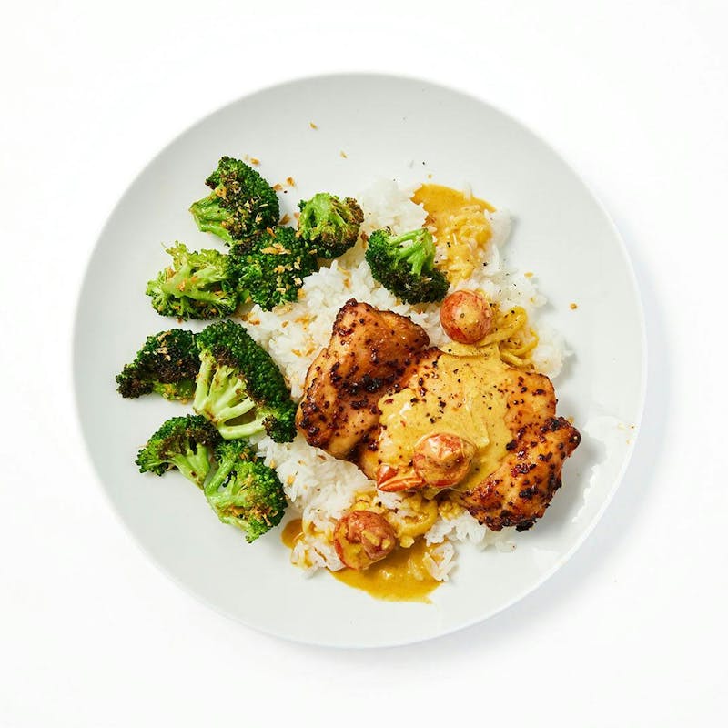 This dish was inspired by Chef Aarthi's grandma's chicken curry. Delicious and fragrant, the traditional Tamil South Indian curry features a rich coconut base and tender chicken thighs. Served with a side of aromatic jasmine rice and garlicky broccoli, this curry brings a little taste of Chef Aarthi's home to your table.