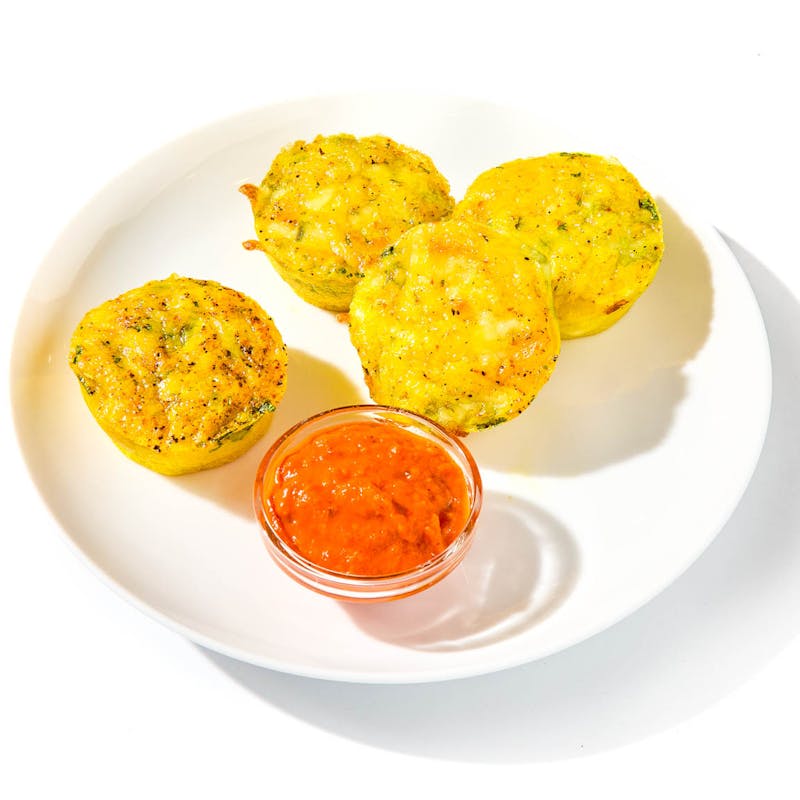 Inspired by the beloved masala omelets found on Indian streets and in home kitchens, Chef Aarthi's egg bites are spiced, savory, and layered with finely chopped onion, red bell pepper, and spinach. Served with a tangy bell pepper tomato chutney on the side for dipping.