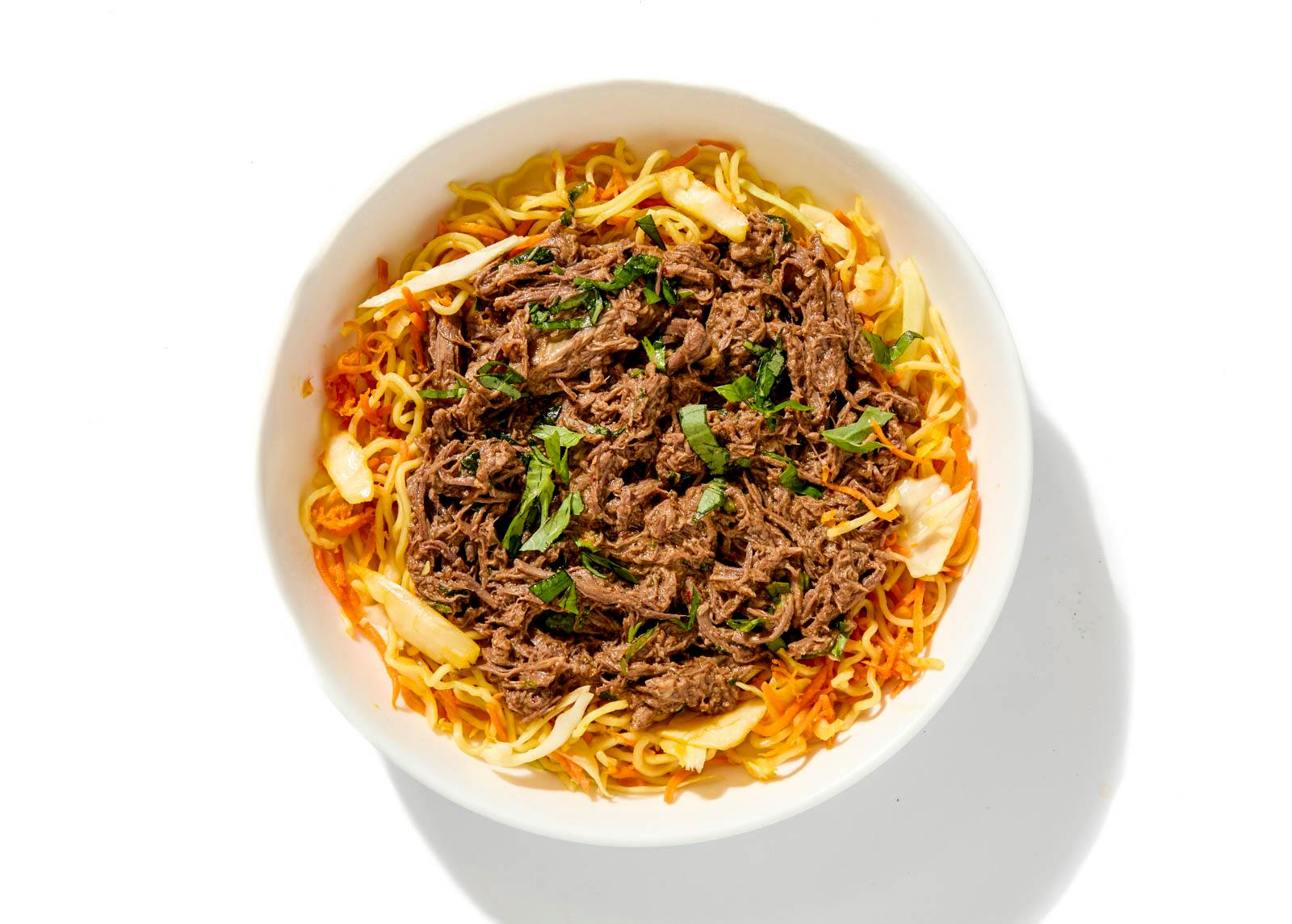 This Thai-inspired dish features beef chuck slow-braised in a red curry with coconut milk, ginger, garlic, and a house spice blend. The fall-apart tender meat is served over chow mein noodles with roasted cabbage and carrots for a cozy boost of veggies and protein.