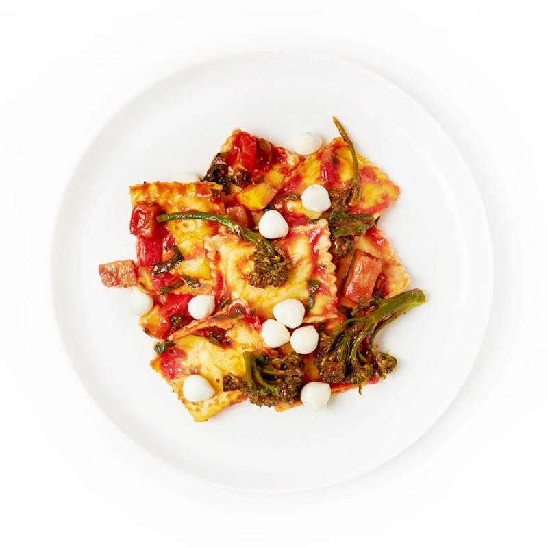 Chef Dustin's Italian comfort cooking is just as good as Nonna's cucina. Tender ravioli are stuffed with a four cheese blend then tossed in a fire-roasted tomato sauce that's enhanced with roasted eggplant, squash, zucchini, and bell pepper, and broccoli rabe. Studded with tiny mozzarella balls and fresh basil, this dish is light and fresh, yet totally satisfying.