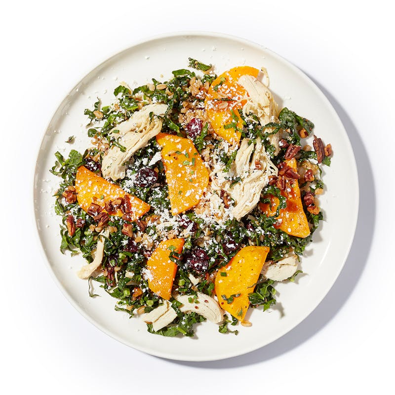 Goat Cheese, Canola and Olive Oil Blend, Butternut Squash, Black Pepper, Honey, Dijon Mustard, Farro, Kosher Salt, Pecans, Apple Cider Vinegar, Kale, Green Onion, Tri-color Quinoa, Chicken Breast, Dried Cranberries, Italian Parsley