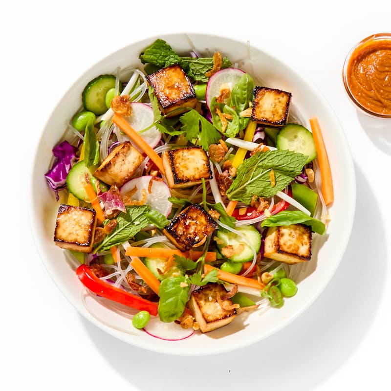 Tofu, Sweet Potato Vermicelli Noodles, Lime, Red Cabbage, Edamame, Red Bell Pepper, Sugar Snap Peas, Cucumber, Maple Syrup, Yellow Bell Pepper, Celery Root, Radish, Orange Juice, Carrots, Gluten Free Tamari, Peanut Butter, Toasted Sesame Oil, Soy Sauce, Rice Wine Vinegar, Sherry Vinegar, Avocado Oil, Garlic, Ginger, Green Onion, Cilantro, Thai Basil, Mint, Sesame Oil, Sriracha, Shio Koji, Peanuts, Cayenne Powder, Crispy Fried Shallots, Sesame Seeds, Black Sesame Seeds