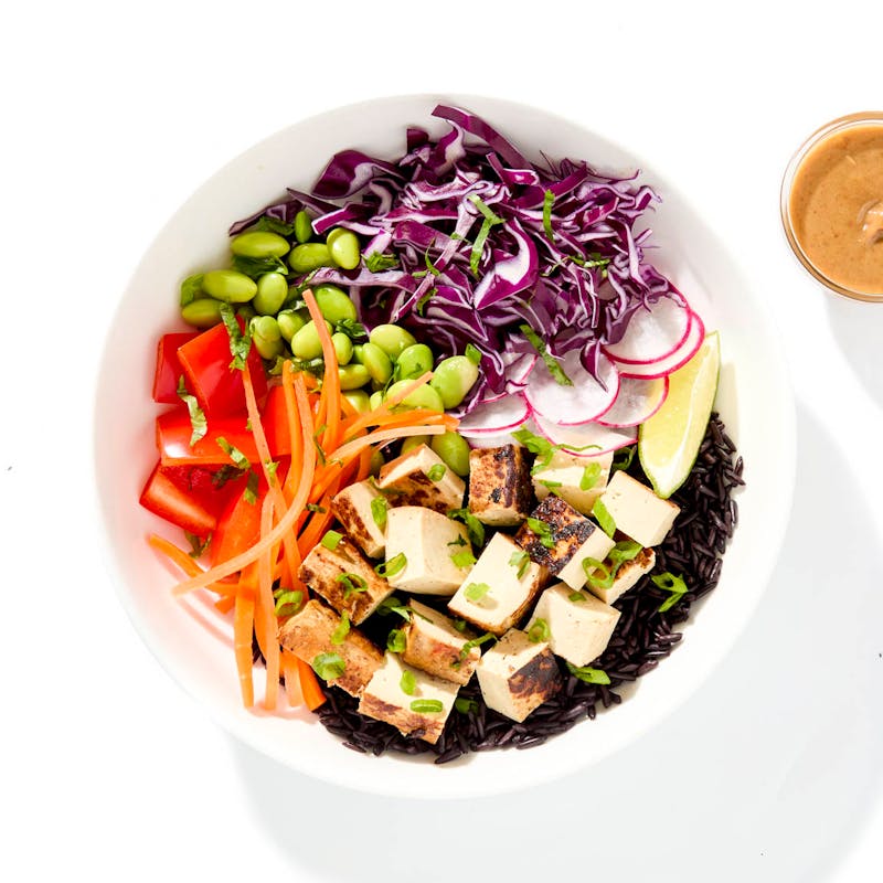 Tofu, Black Rice, Edamame, Red Cabbage, Mini Bell Pepper, Green Onion, Lime, Radish, Carrots, Tahini Paste, Sriracha, Sherry Vinegar, Maple Syrup, Cilantro, Shio Koji, Kosher Salt, Kombu, Garlic, Ginger, Red Sambal Chili Paste, Toasted Sesame Oil
