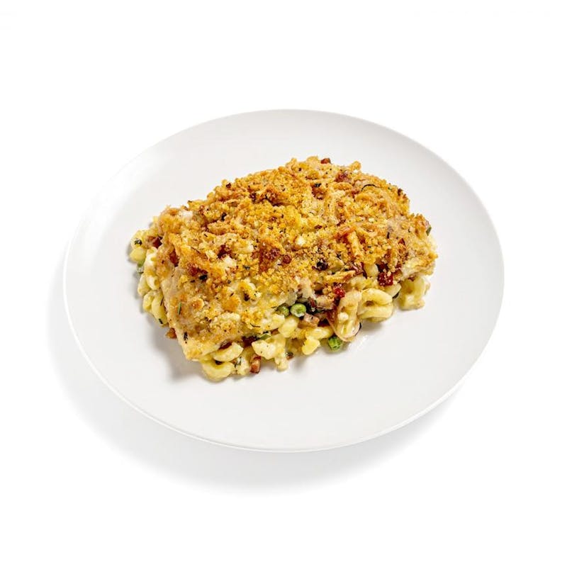 Chives, Cream Cheese, Canola and Olive Oil Blend, Butter, Onion, Rosemary, Swiss Cheese, Black Pepper, Garlic, Heavy Cream, Onion, Peas, Kosher Salt, Shallot, Blue Cheese, Thyme, Pancetta, Panko Breadcrumbs, White Wine, Canola Oil, Whole Milk, Italian Parsley, Elbow Pasta, Cauliflower, Parmesan Cheese