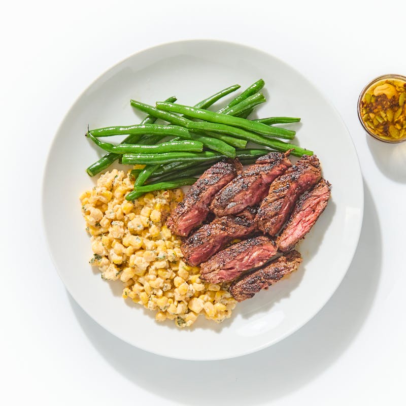 Skirt steak gets a deep, smoky crust from a house pasilla rub, then lands beside garlic green beans and esquites—sweet corn tossed with creamy ají amarillo aioli, lime, and Cotija. A chile morita macha oil adds the final touch: heat, depth, and a hint of nutty crunch.