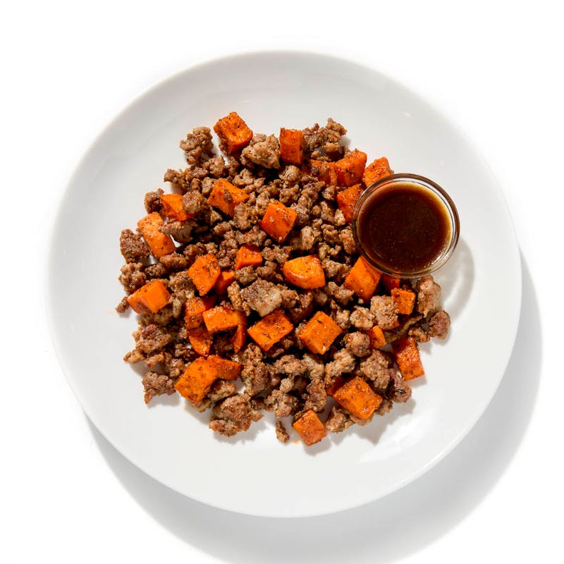 This rustic, one-pan dish pairs the savory richness of seasoned ground beef and pork with the natural sweetness of oven-roasted vegetables. The meat is bronzed until tender and juicy, then layered with a colorful mix of sweet potatoes, zucchini and bell peppers —all caramelized for deep, smoky flavor. It's served with a drizzle of maple-Dijon vinaigrette to brighten the plate.