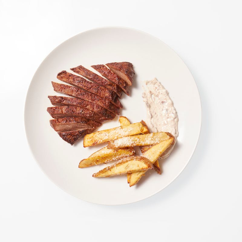 This classic dish pairs a beautiful flat iron steak flavored with barbecue spices and Dijon mustard with crispy potato wedges infused with parmesan butter. A side of black truffle garlic aioli takes everything up a notch!