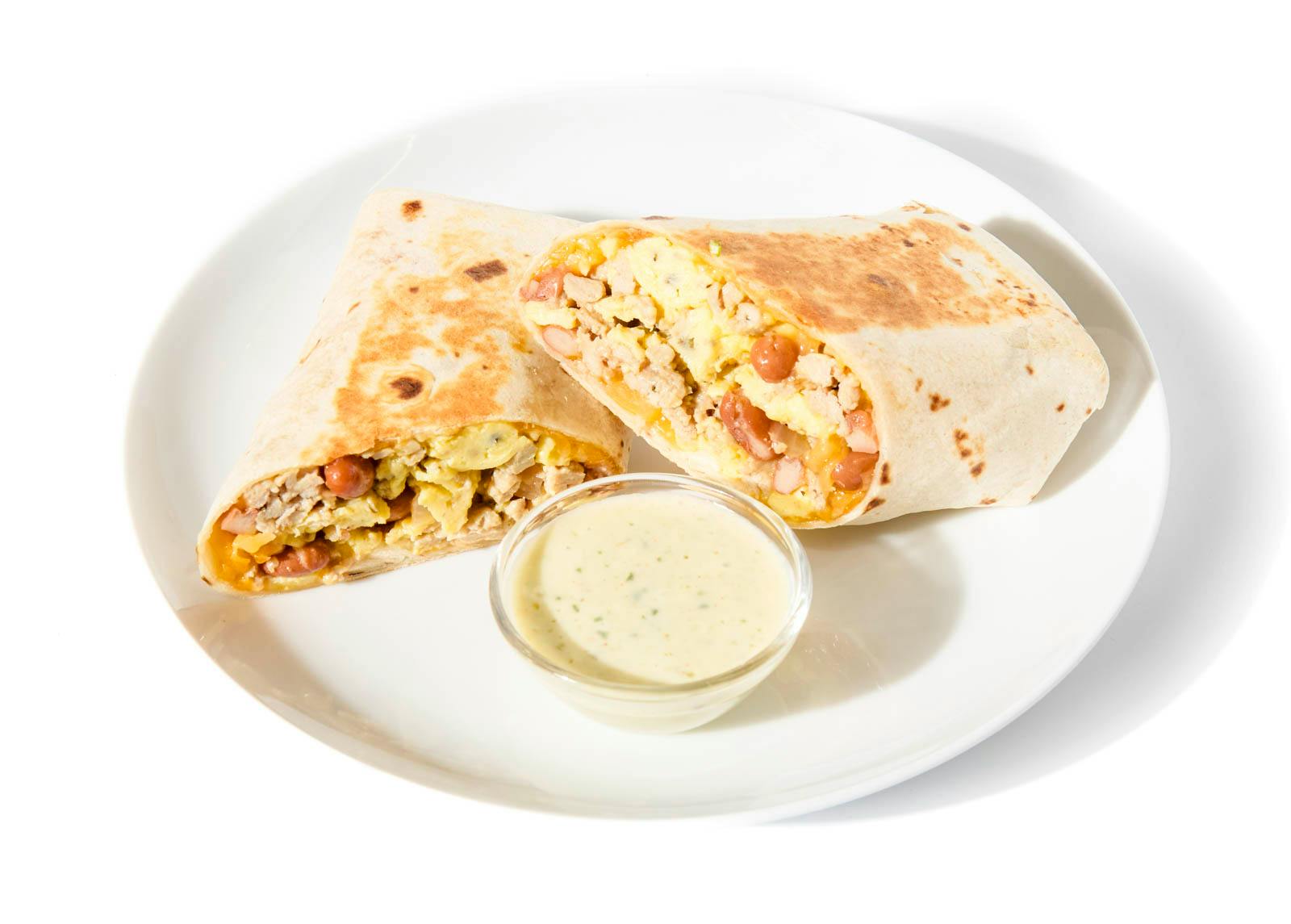 This savory morning wrap packs in Italian sausage, soft-scrambled egg, pinto beans, and sharp cheddar. Chef David serves it with a jalapeño herb yogurt sauce that’s creamy, tangy, and just spicy enough to wake you up.