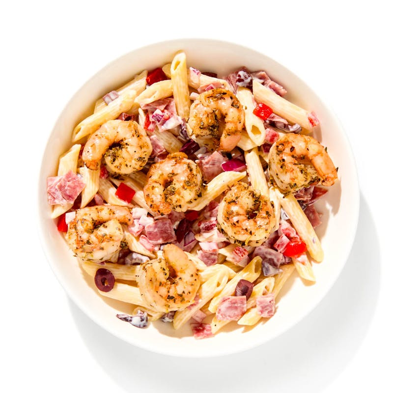 Shrimp, pasta, salami—this bowl came to party. Shrimp are seared with garlic, lemon zest, oregano, and thyme until golden and fragrant. They're served up with a chilled penne salad packed with Genoa salami, kalamata olives, piquillo peppers, red onion, and fresh parsley. Everything’s tied together with a creamy Dijon dressing that’s rich enough to satisfy but light enough to keep things moving.