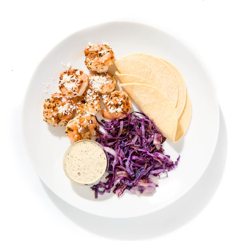 Canola and Olive Oil Blend, Corn Tortilla, Oregano, Onion Powder, Garlic Powder, Shrimp, Black Pepper, Cilantro, Lemon Zest, Onion, Kosher Salt, Yellow Mustard, Cotija Cheese, Mayonnaise, Blackened Seasoning, Tabasco Sauce, Green Onion, Thyme, Lemon Juice, Pickled Jalapeno Peppers, Pickles, Red Cabbage