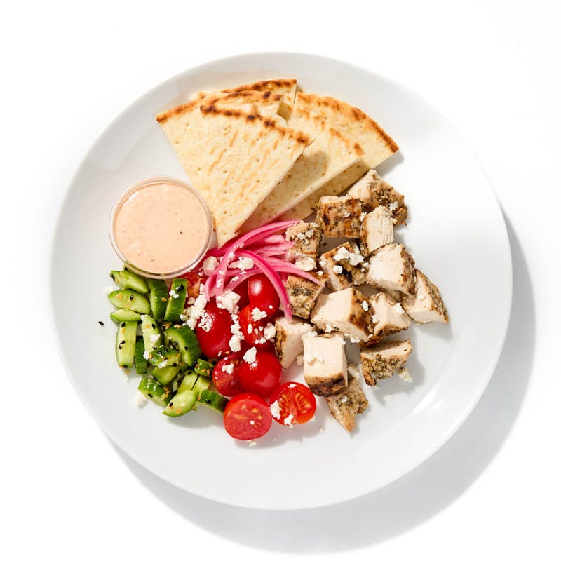 Chives, Sesame Oil, Canola and Olive Oil Blend, Red Onion, Cherry Tomato, Avocado Oil, Black Pepper, Garlic, Lemon Zest, Feta Cheese, Kosher Salt, Black Sesame Seeds, White Vinegar, Mayonnaise, Light Brown Sugar, Pita Bread, Chicken Breast, Ranch Dressing Powder, Whole Milk, Cucumber, Canned Piquillo Peppers, Italian Herb Seasoning, Sesame Seeds