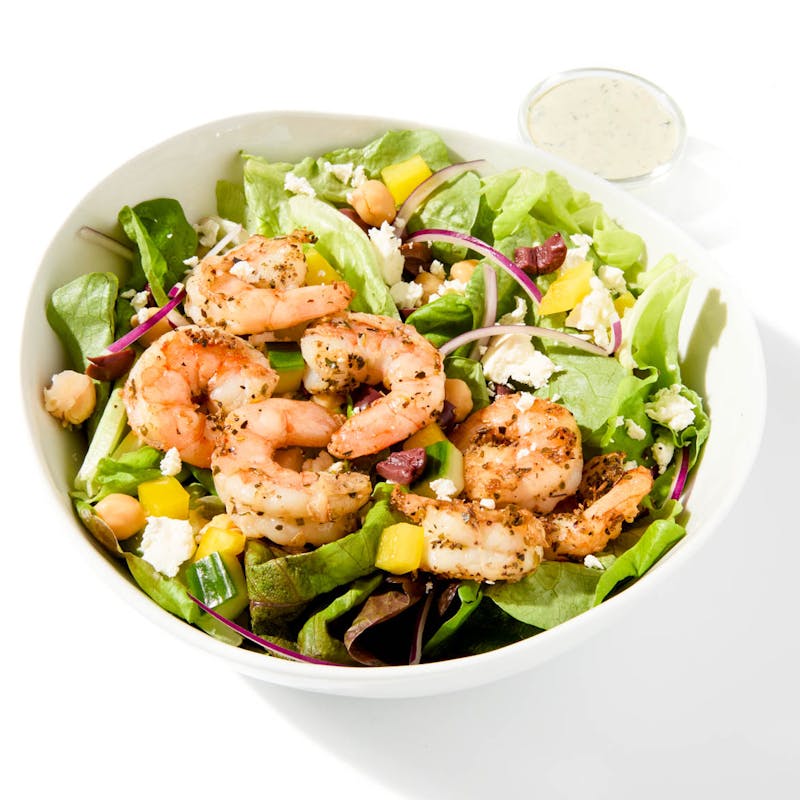 Rosemary, Canola and Olive Oil Blend, Mixed Greens, Yellow Bell Pepper, Oregano, Red Onion, Shrimp, Black Pepper, Cilantro, Kalamata Olives, Feta Cheese, Kosher Salt, Cucumber, Mayonnaise, Granulated Garlic, Canned Chickpeas, Ranch Dressing Powder, Whole Milk, Italian Parsley