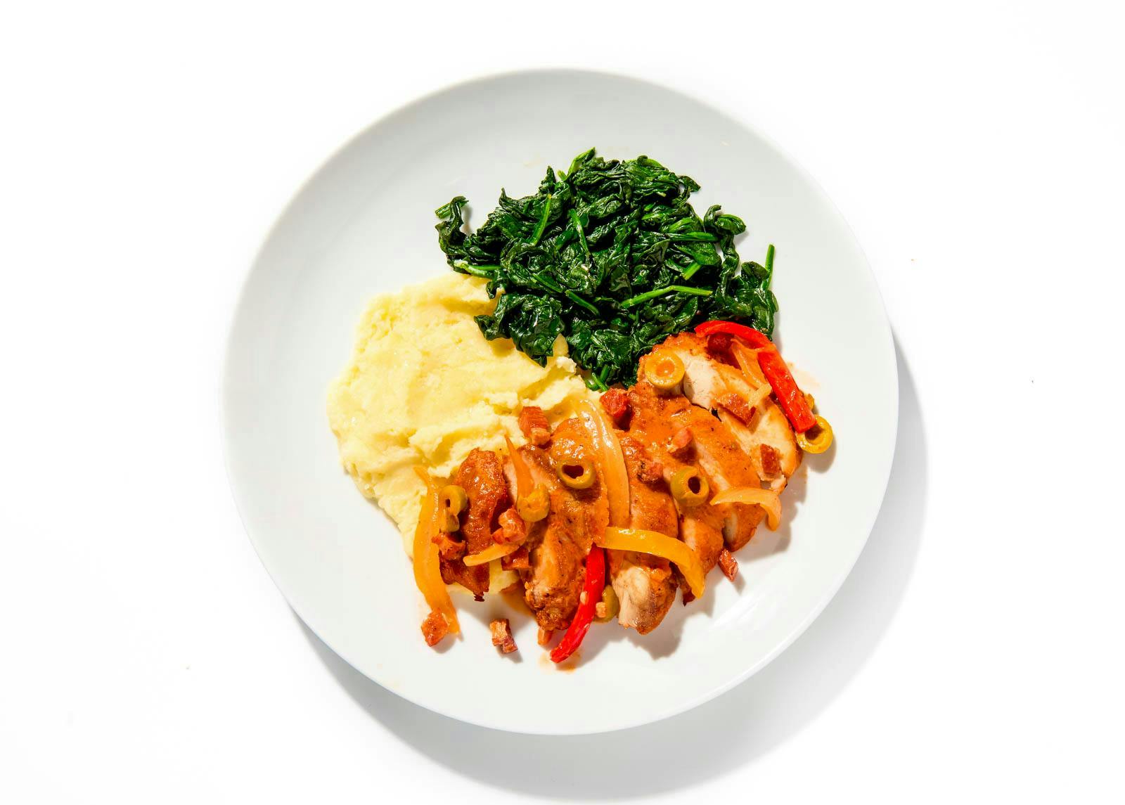 Chef John’s take on a rustic Italian classic. Golden-seared chicken thighs are slowly simmered in a fragrant tomato and white wine sauce, alongside smoky pancetta and sweet bell peppers. Brimming with herbs, spices, and briny green olives, it’s served with creamy mashed potatoes and softly steamed spinach.