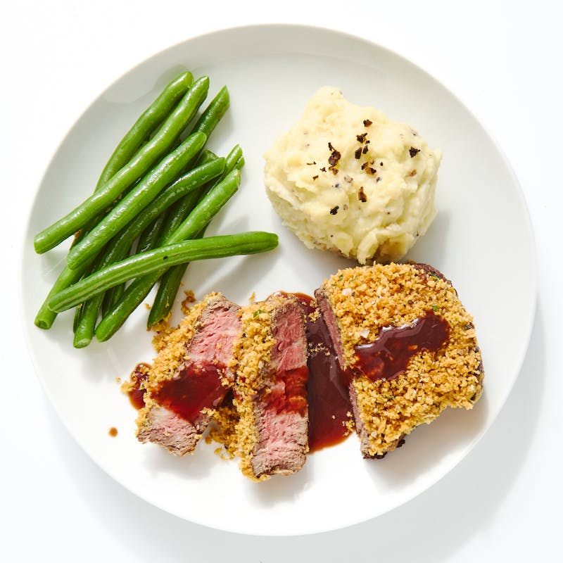 A succulent beef tenderloin is made even more irresistible when coated with tangy Dijon mustard and parmesan crust and seared to perfection. The mustard crust adds a zesty kick, enhancing the overall richness of this premium cut of beef. Paired with truffle-infused mashed potatoes, garlicky green beans, and a red wine reduction, this is the perfect choice for anyone looking to bring a sophisticated dining experience to their very own home kitchen.
