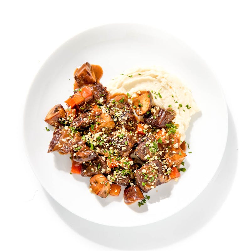 Bay Leaf, All Purpose Flour, Butter, Extra Virgin Olive Oil, Carrots, Rosemary, Beef Base, Beef Short Ribs, Black Pepper, Tomato Paste, Garlic, Lemon Zest, Heavy Cream, Red Wine, Kosher Salt, Shallot, Yukon Potatoes, Bacon, Crimini Mushroom, Thyme, Panko Breadcrumbs, Italian Parsley