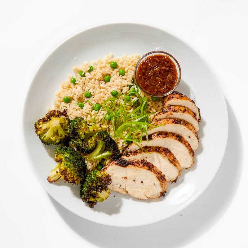 Chicken breast is marinated with garlic, ginger, soy, rice vinegar, and a toasted spice blend of pink peppercorn, cumin, fennel, and clove for layered warmth and aromatic depth. Served with roasted broccoli, brown rice with peas, and a garlic scallion sauce on the side.