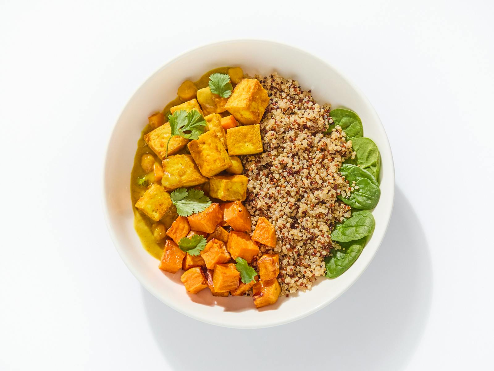 Tofu, Sweet Potatoes, Tri-color Quinoa, Canned Chickpeas, Coconut Milk, Green Peas, Carrots, Baby Spinach, Canola and Olive Oil Blend, Yellow Curry Paste, Shallot, Light Soy Sauce, Ginger, Turmeric, Garlic, Mushroom Seasoning, Lime Juice, Cilantro, Light Brown Sugar, Crushed Red Pepper, Kosher Salt