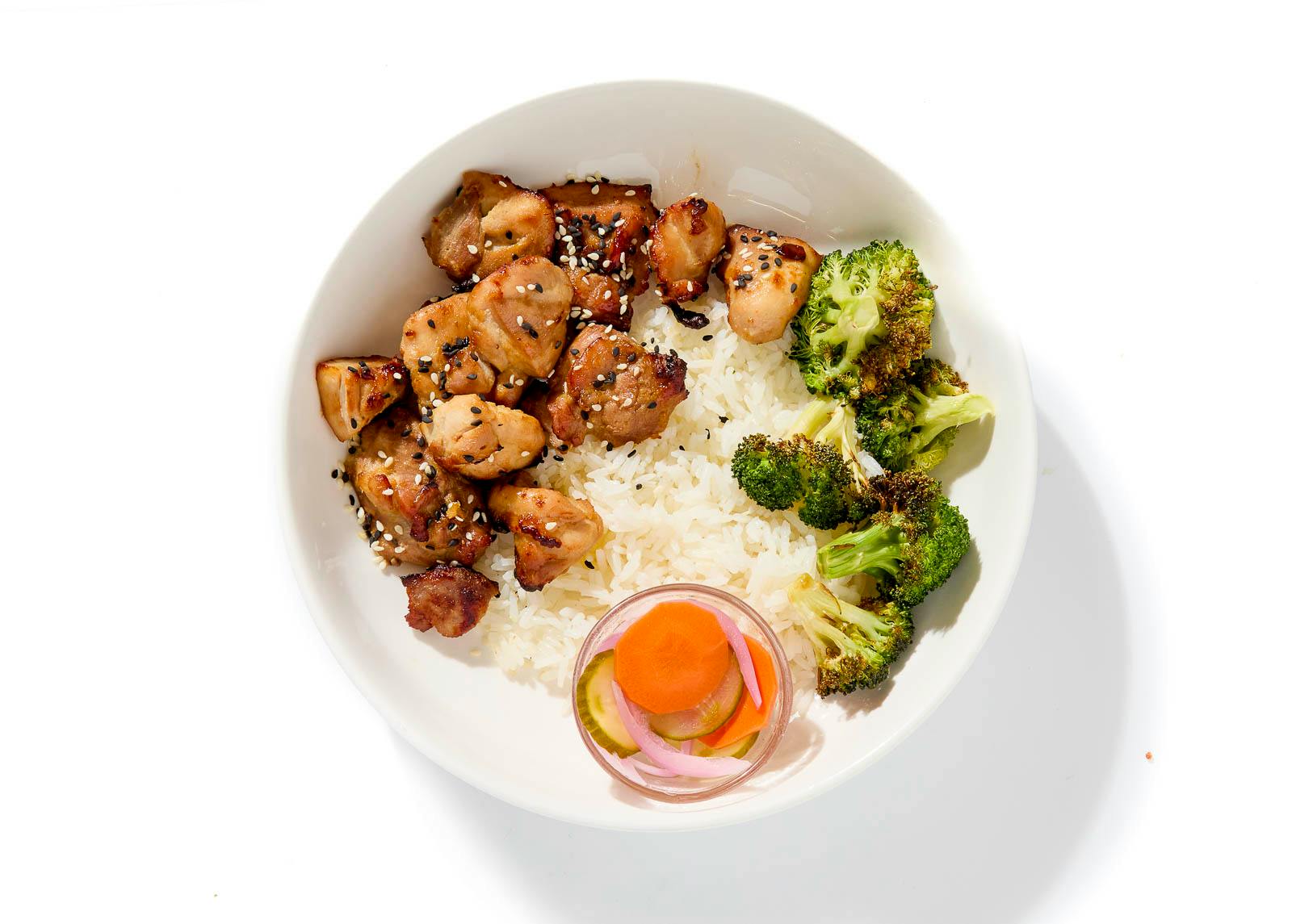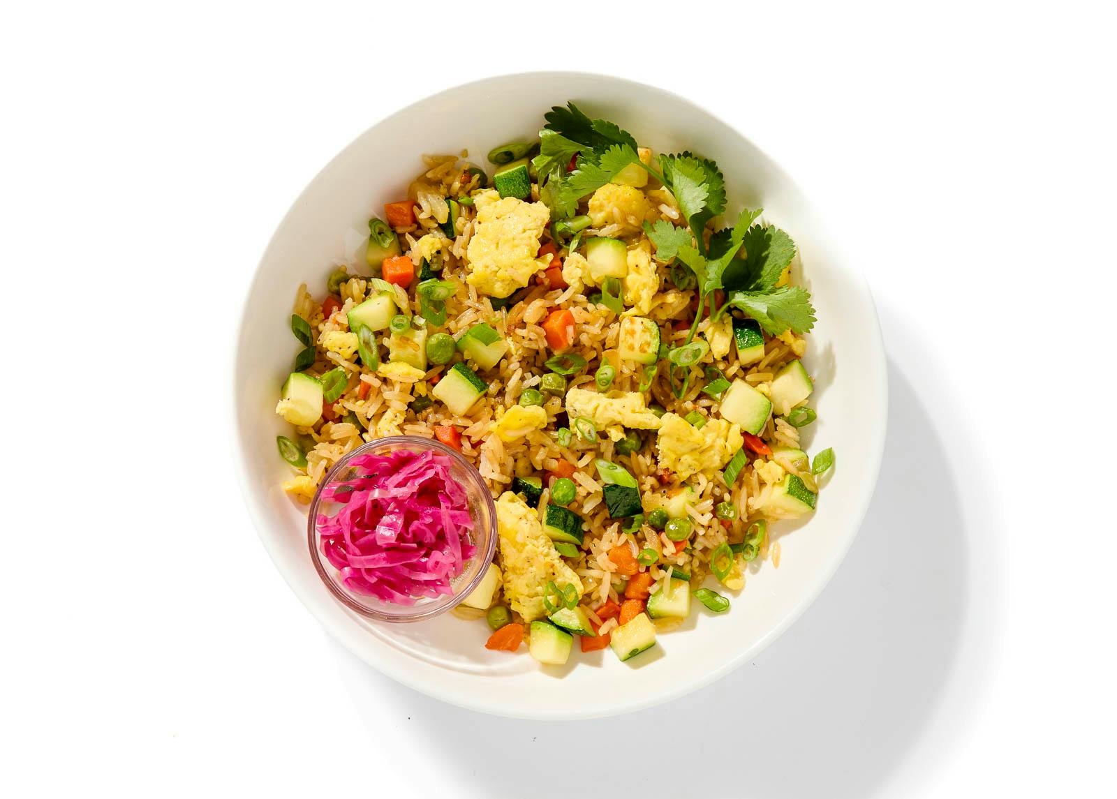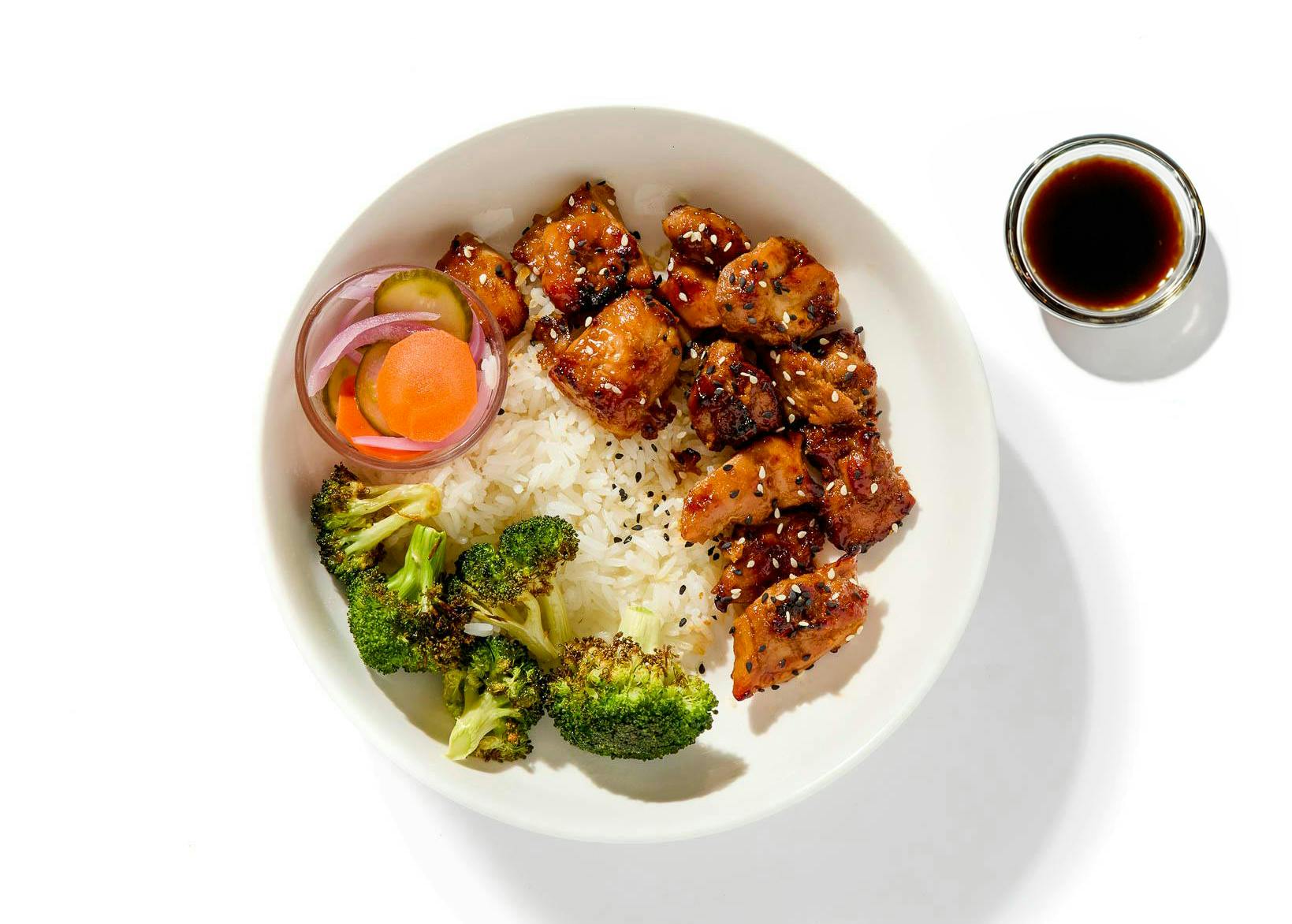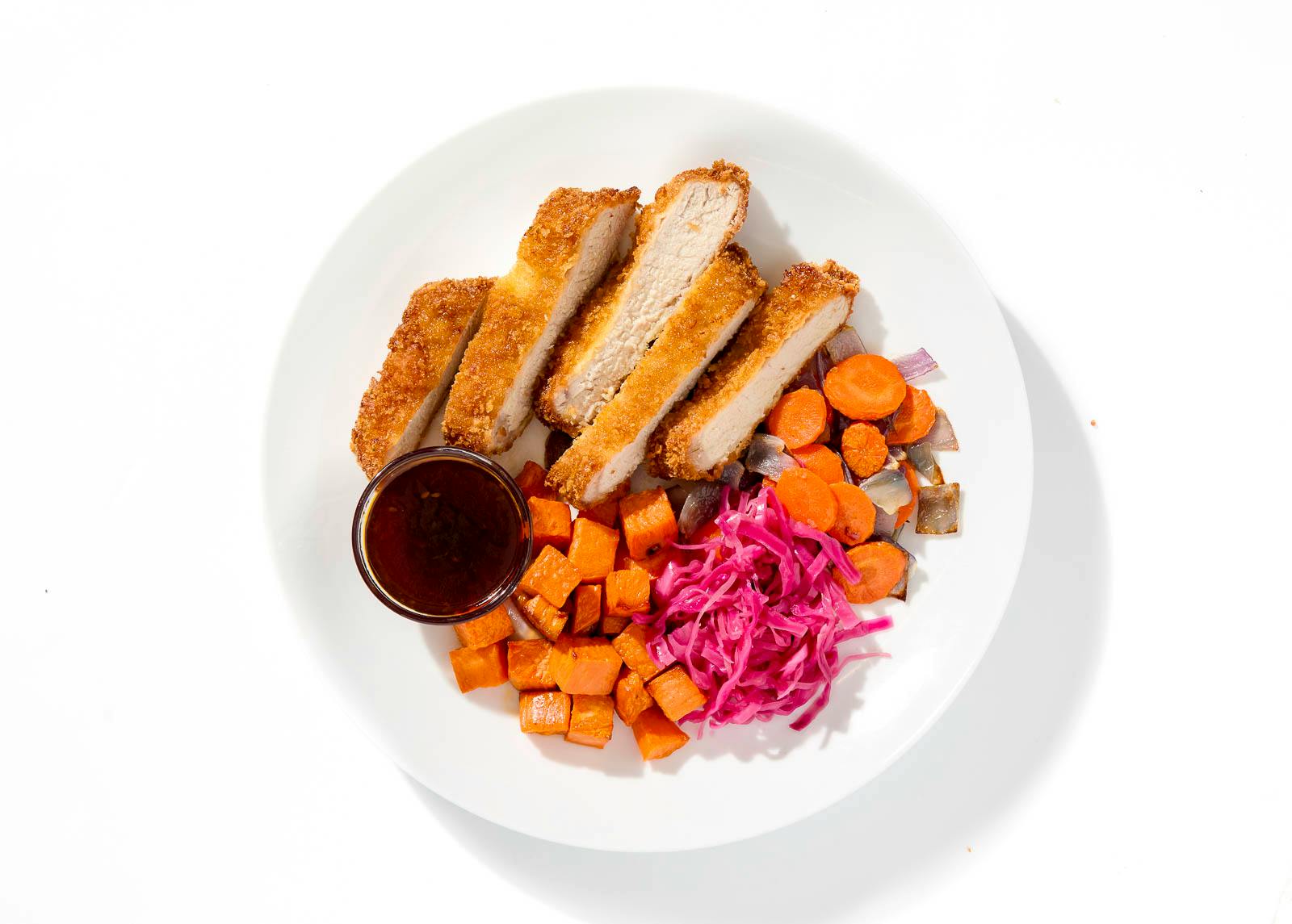 Chef Alejandro pairs panko-fried pork tenderloin with gochugaru-dusted roasted sweet potatoes, a warm onion-and-carrot medley, and a side of pickled red cabbage. Served with a tangy-sweet tonkatsu sauce on the side.