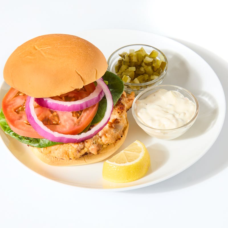 Hand-chopped salmon is mixed with capers, mustard, and shallots, then seared for a rich patty. Served with a soft bun, tangy housemade tartar sauce, and candied jalapeño relish for a bright, briny punch.